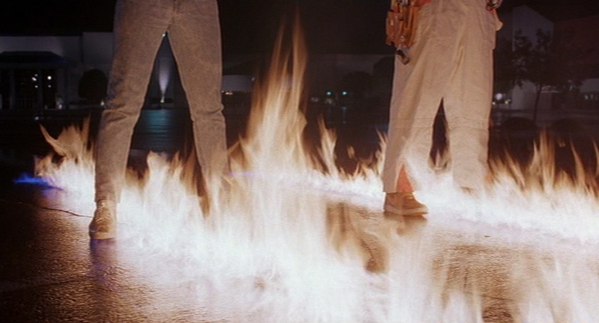 Michael J. Fox's screen right foot was placed behind fire licks via frame-by-frame rotoscoping. Areas of fire were articulated to bury Fox's foot within the fire. Like the previous two shots, the background plate was skip printed to give the fire trails more energy and speed.